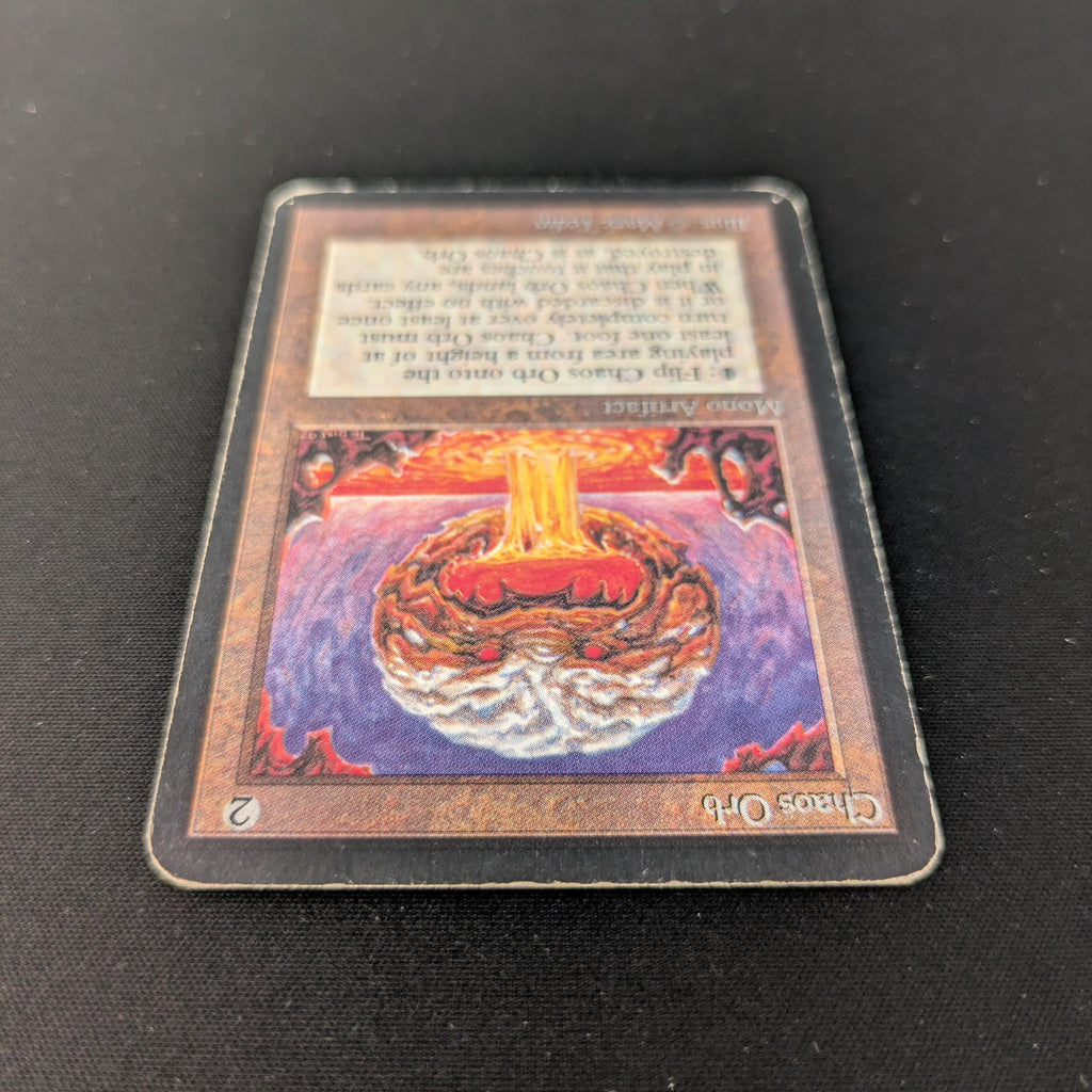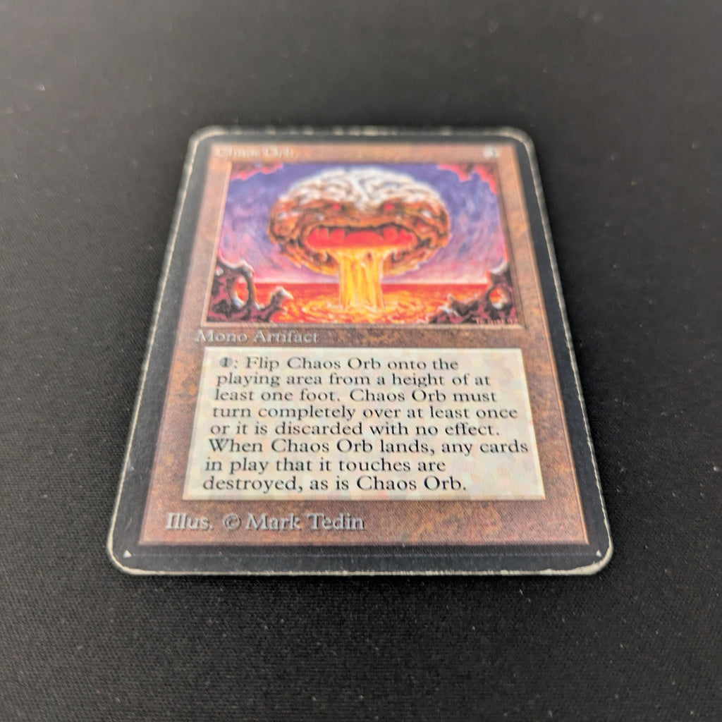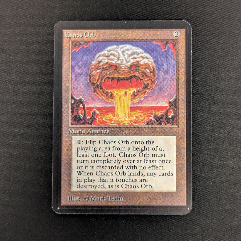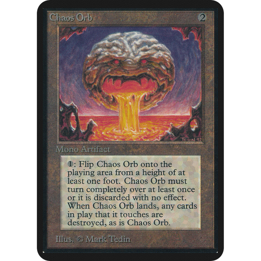 : If Chaos Orb is on the battlefield, flip Chaos Orb onto the battlefield from a height of at least one foot. If Chaos Orb turns over completely at least once during the flip, destroy all nontoken permanents it touches. Then destroy Chaos Orb.