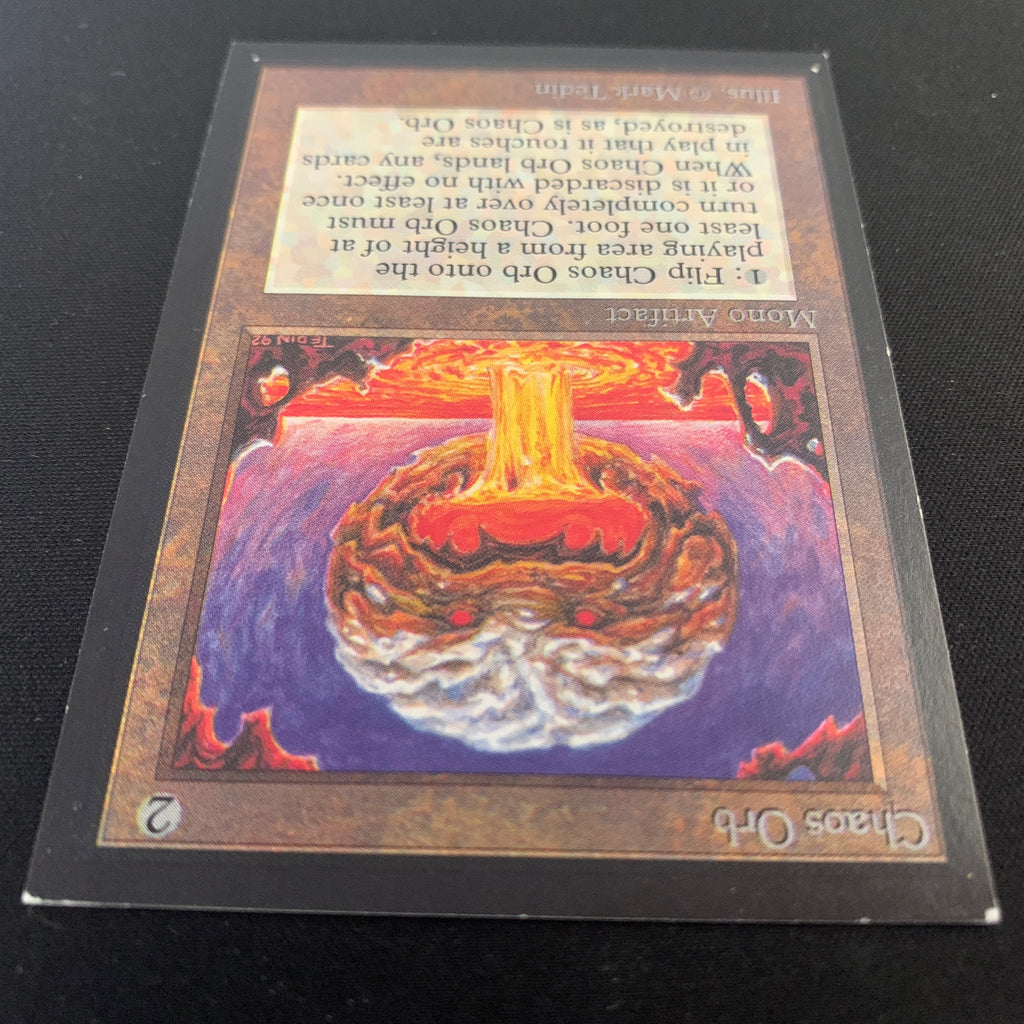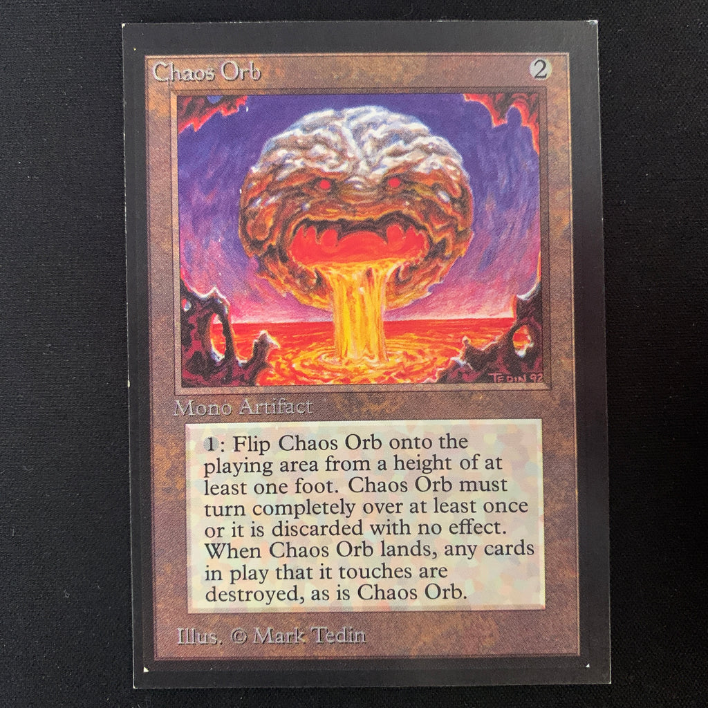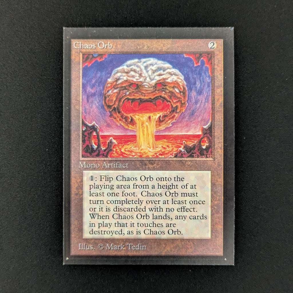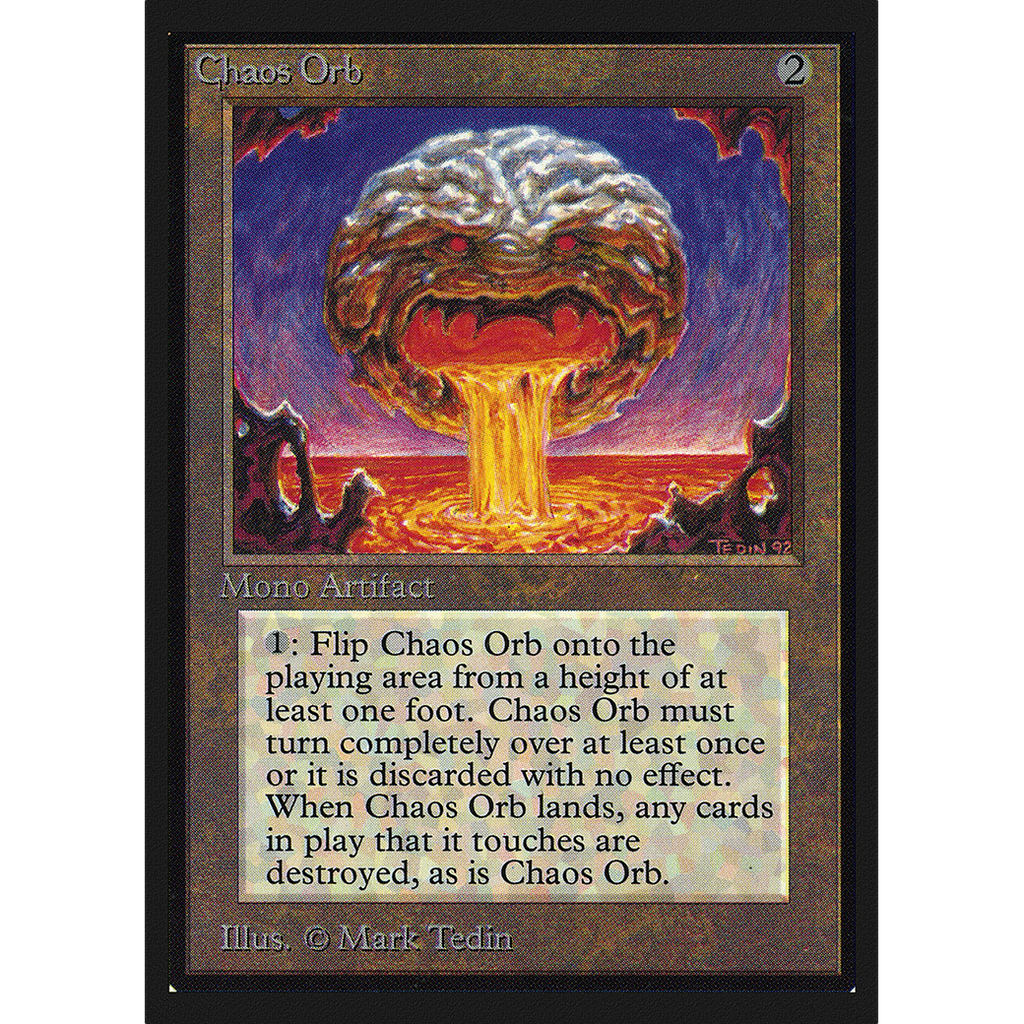 : If Chaos Orb is on the battlefield, flip Chaos Orb onto the battlefield from a height of at least one foot. If Chaos Orb turns over completely at least once during the flip, destroy all nontoken permanents it touches. Then destroy Chaos Orb.