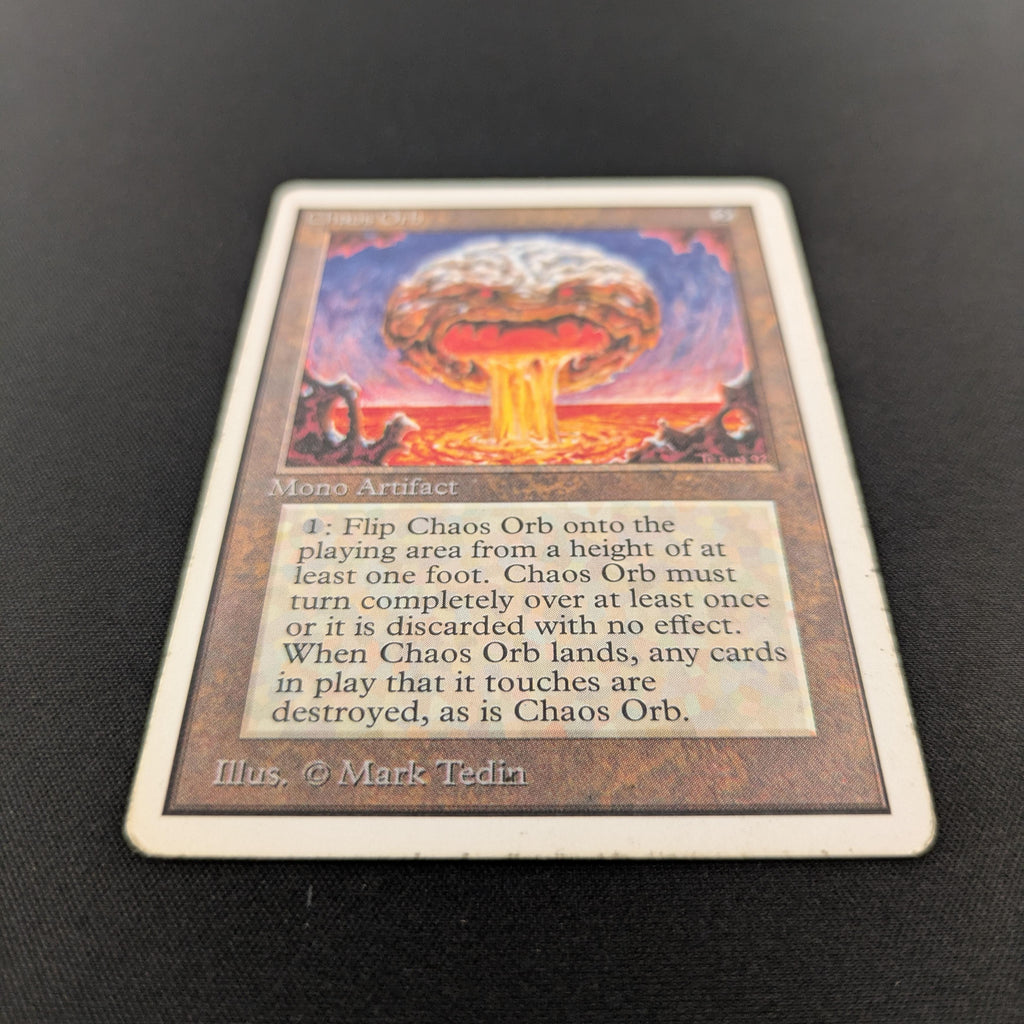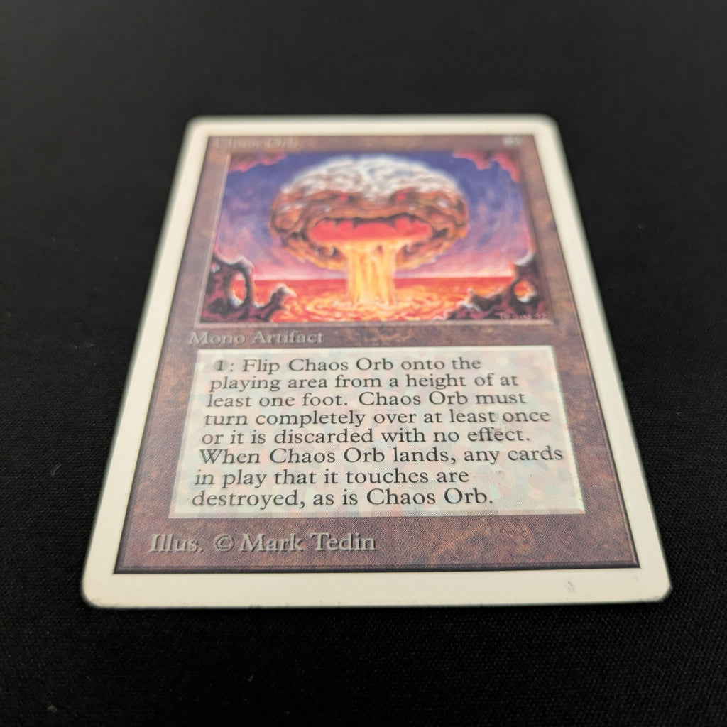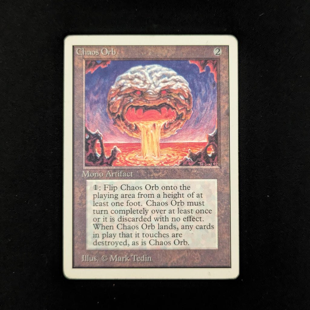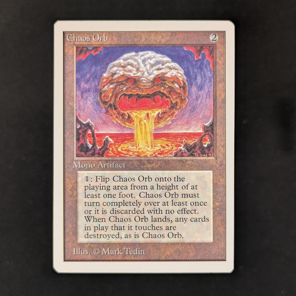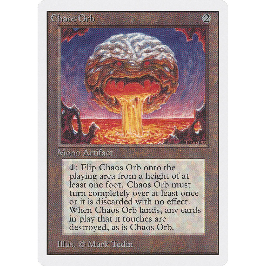 : If Chaos Orb is on the battlefield, flip Chaos Orb onto the battlefield from a height of at least one foot. If Chaos Orb turns over completely at least once during the flip, destroy all nontoken permanents it touches. Then destroy Chaos Orb.