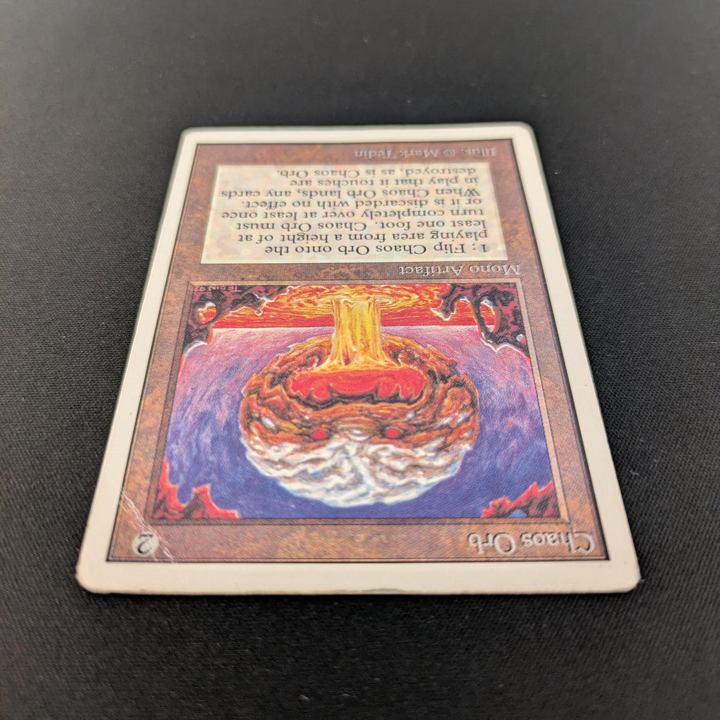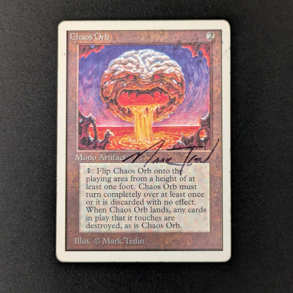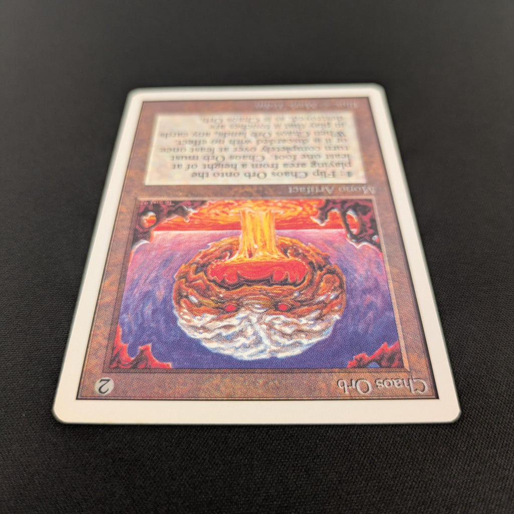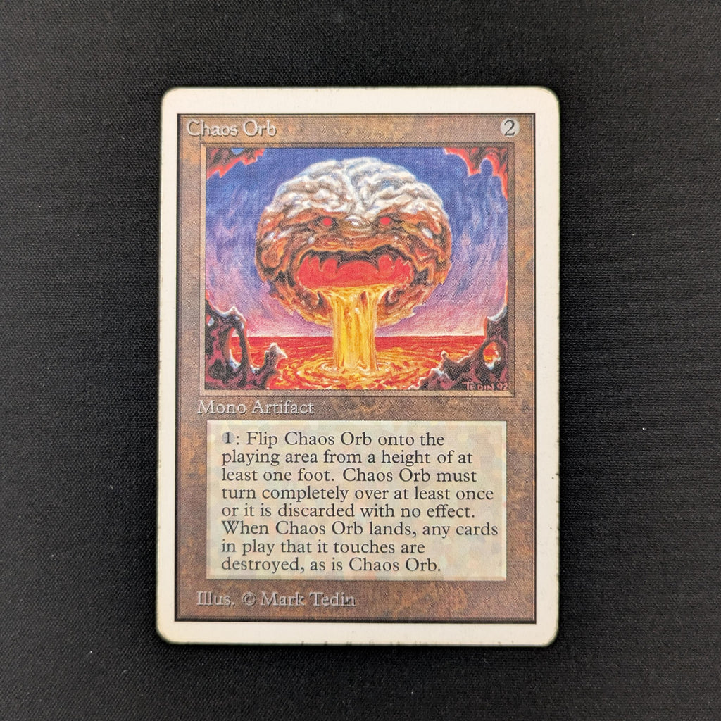 : If Chaos Orb is on the battlefield, flip Chaos Orb onto the battlefield from a height of at least one foot. If Chaos Orb turns over completely at least once during the flip, destroy all nontoken permanents it touches. Then destroy Chaos Orb.