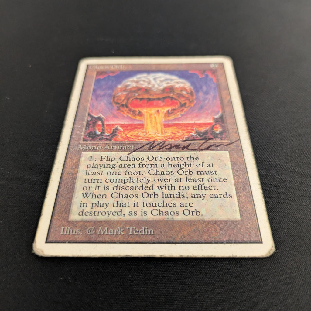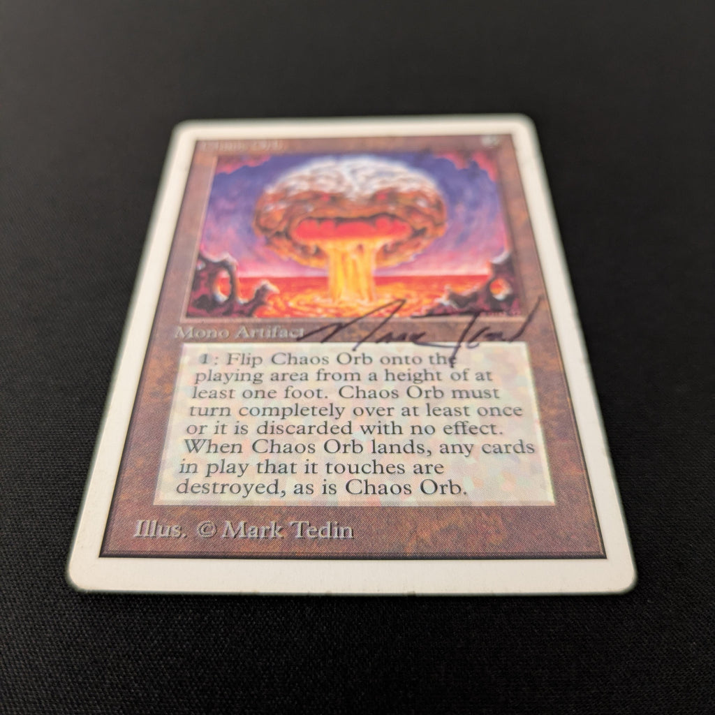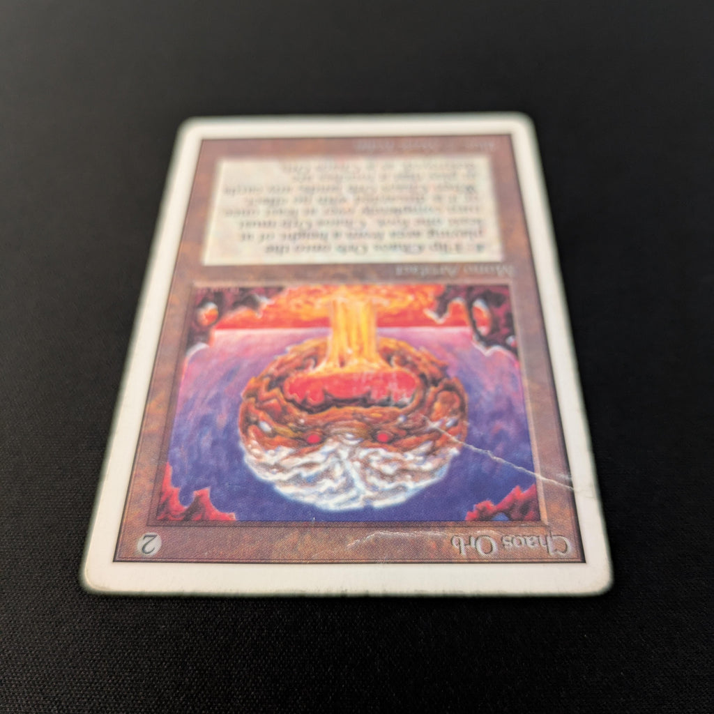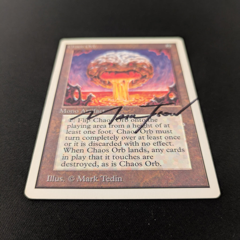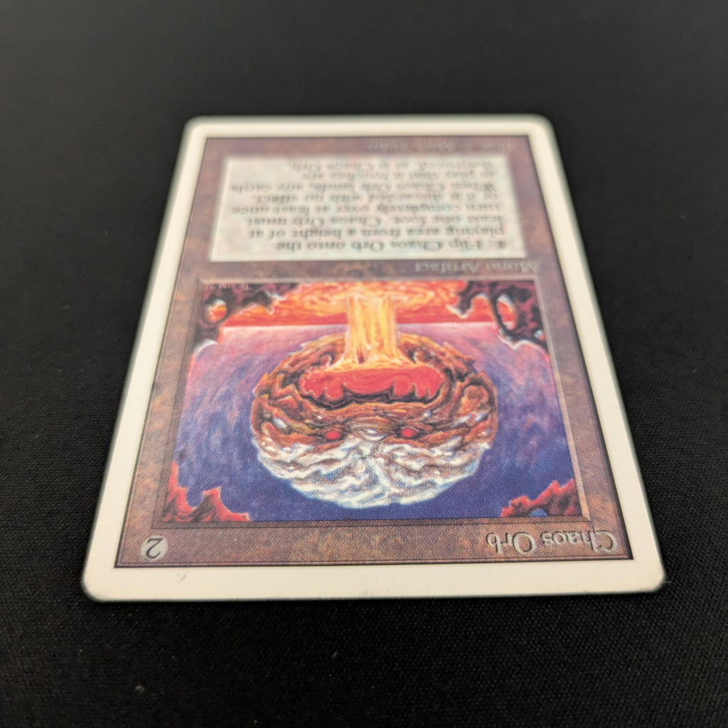 : If Chaos Orb is on the battlefield, flip Chaos Orb onto the battlefield from a height of at least one foot. If Chaos Orb turns over completely at least once during the flip, destroy all nontoken permanents it touches. Then destroy Chaos Orb.