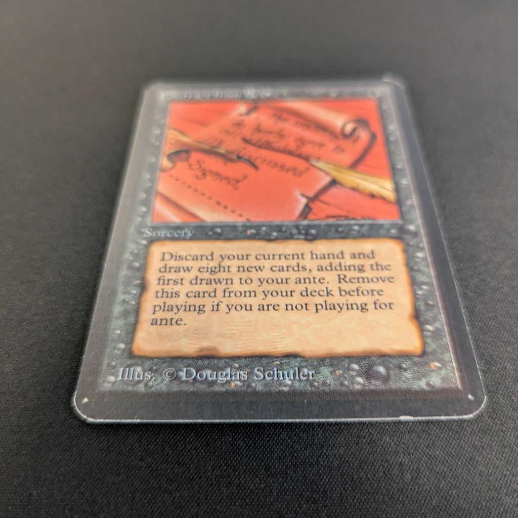 Discard your hand, ante the top card of your library, then draw seven cards.
