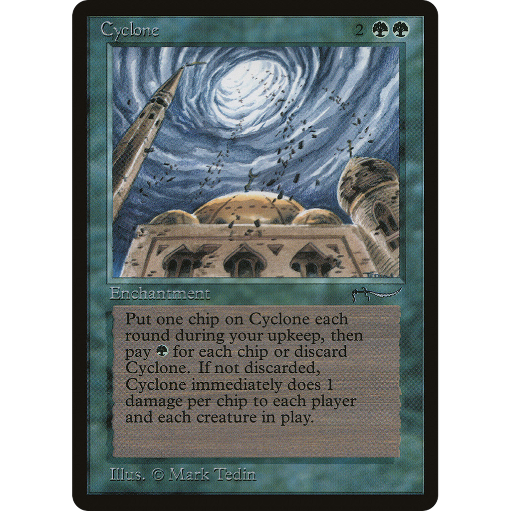 At the beginning of your upkeep, put a wind counter on Cyclone, then sacrifice Cyclone unless you pay for each wind counter on it. If you pay, Cyclone deals damage equal to the number of wind counters on it to each creature and each player.