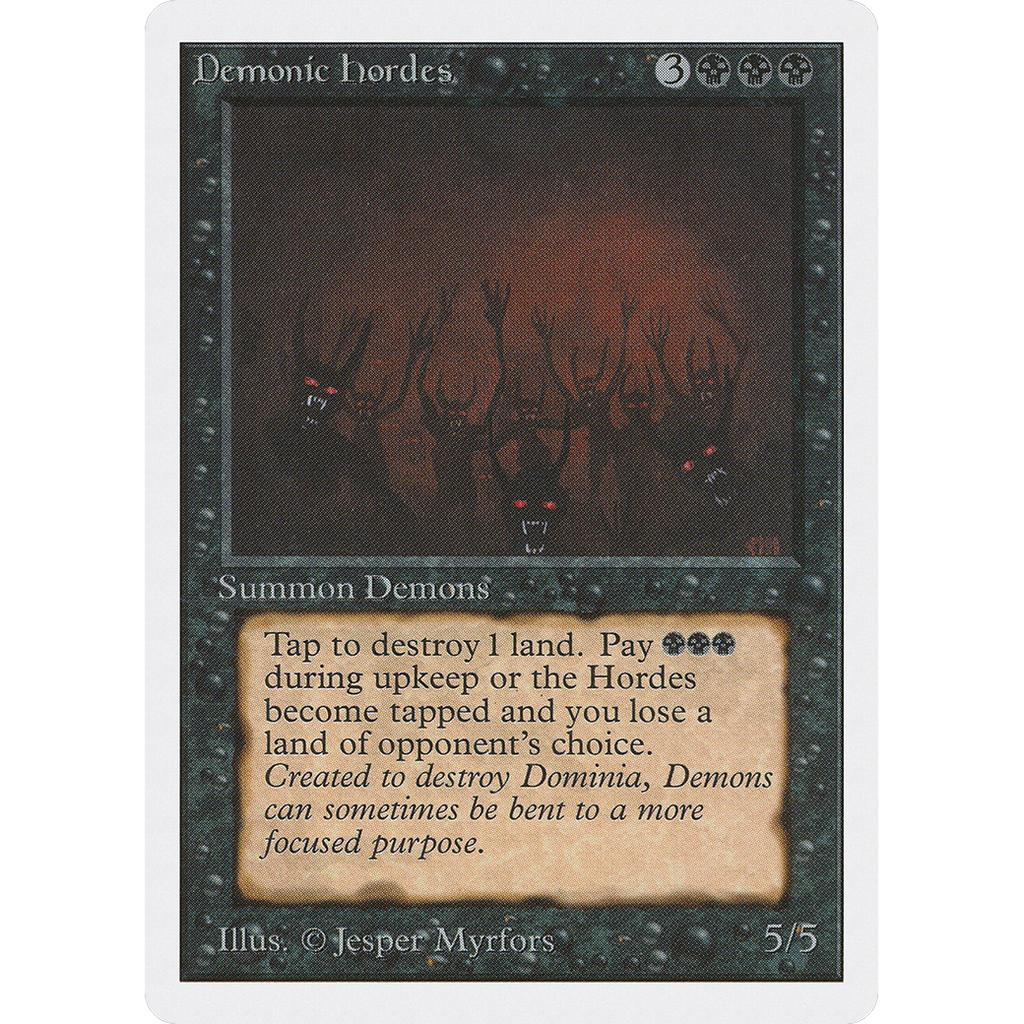 At the beginning of your upkeep, unless you pay , tap Demonic Hordes and sacrifice a land of an opponent's choice.