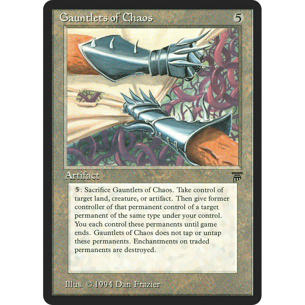 Card Text, Sacrifice Gauntlets of Chaos: Exchange control of target artifact, creature, or land you control and target permanent an opponent controls that shares one of those types with it. If those permanents are exchanged this way, destroy all Auras attached to them.