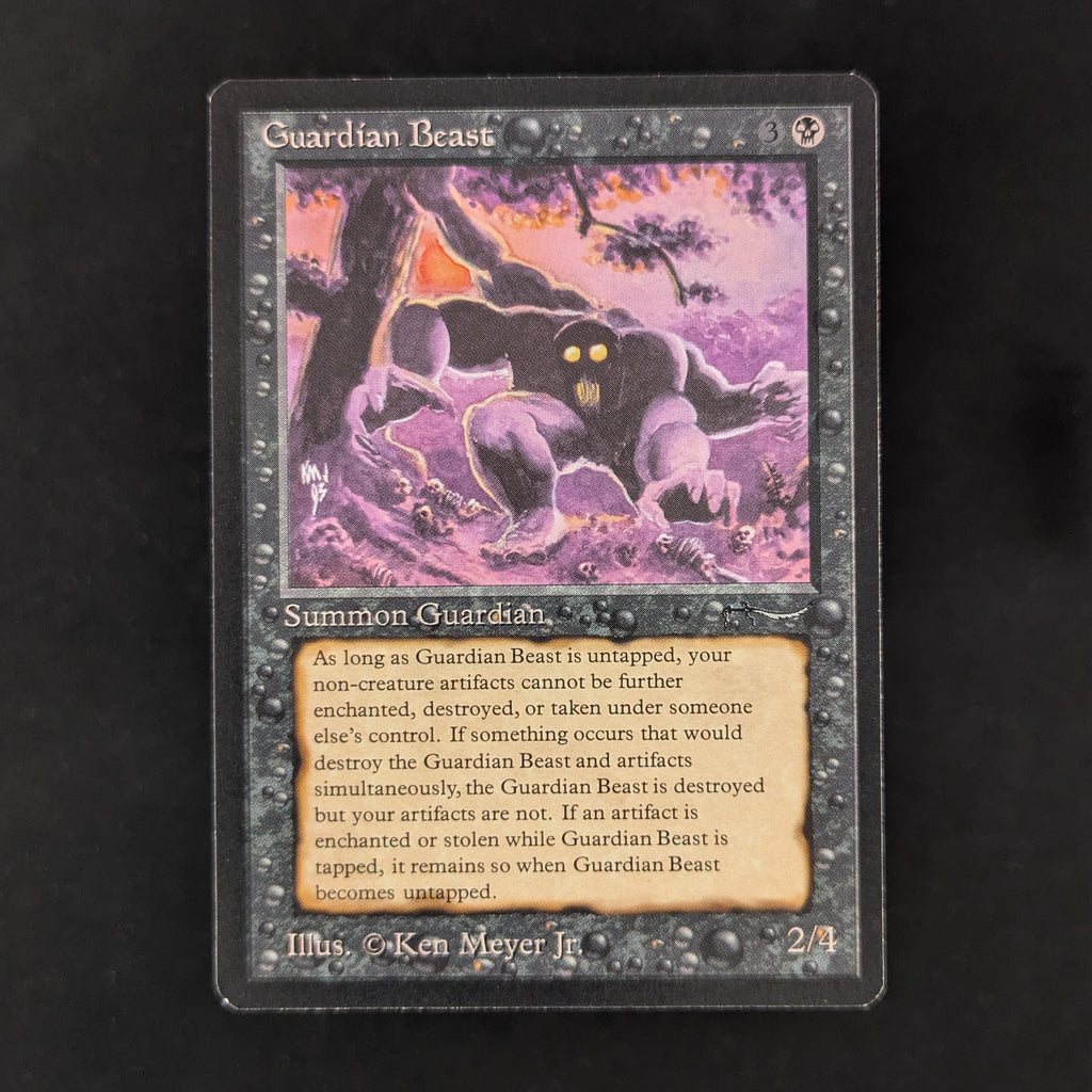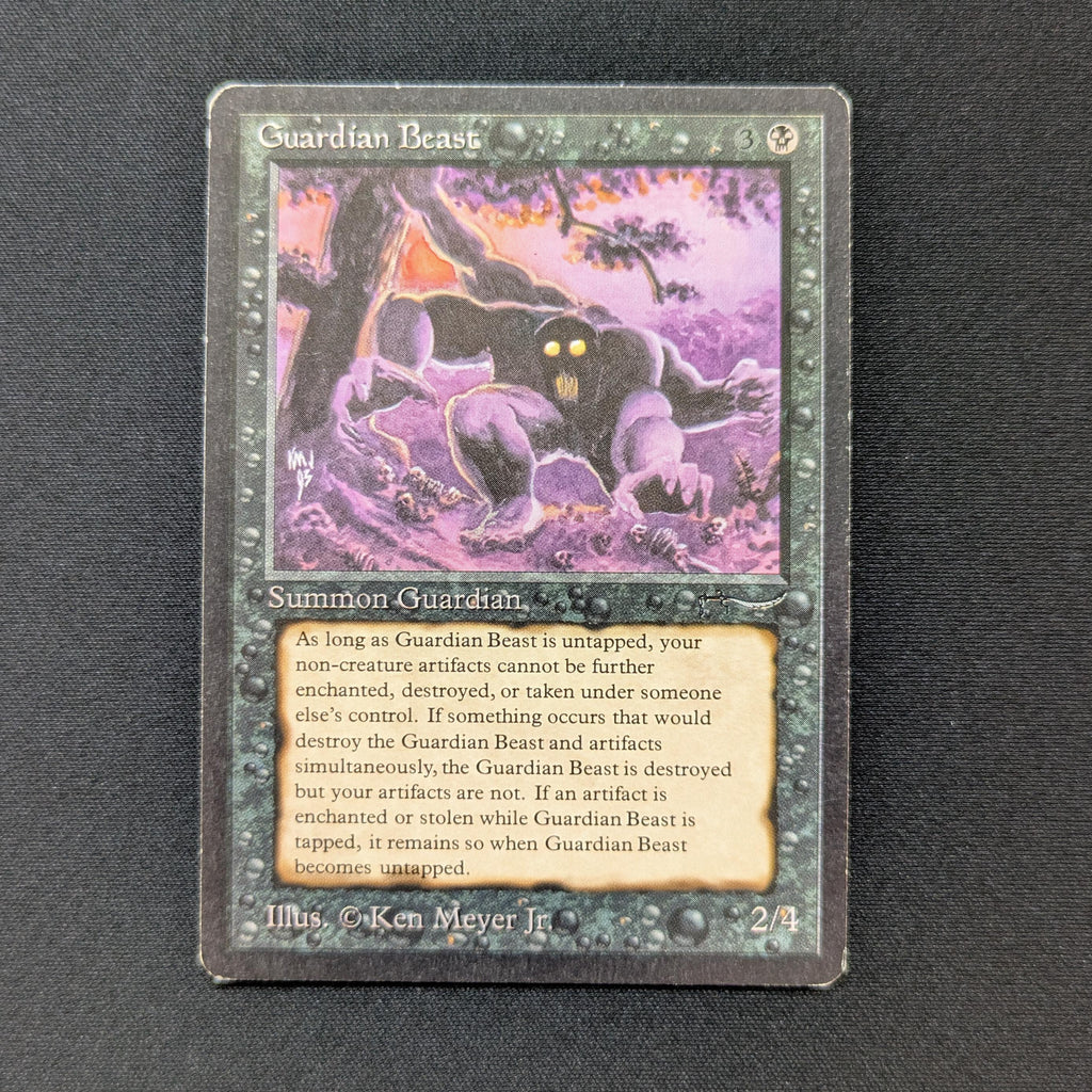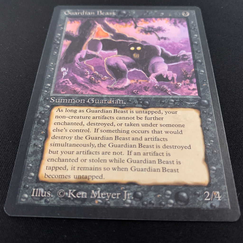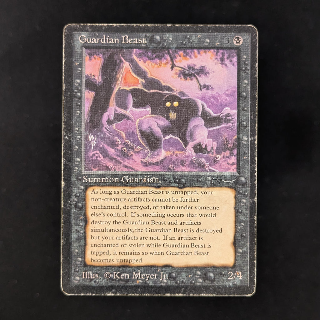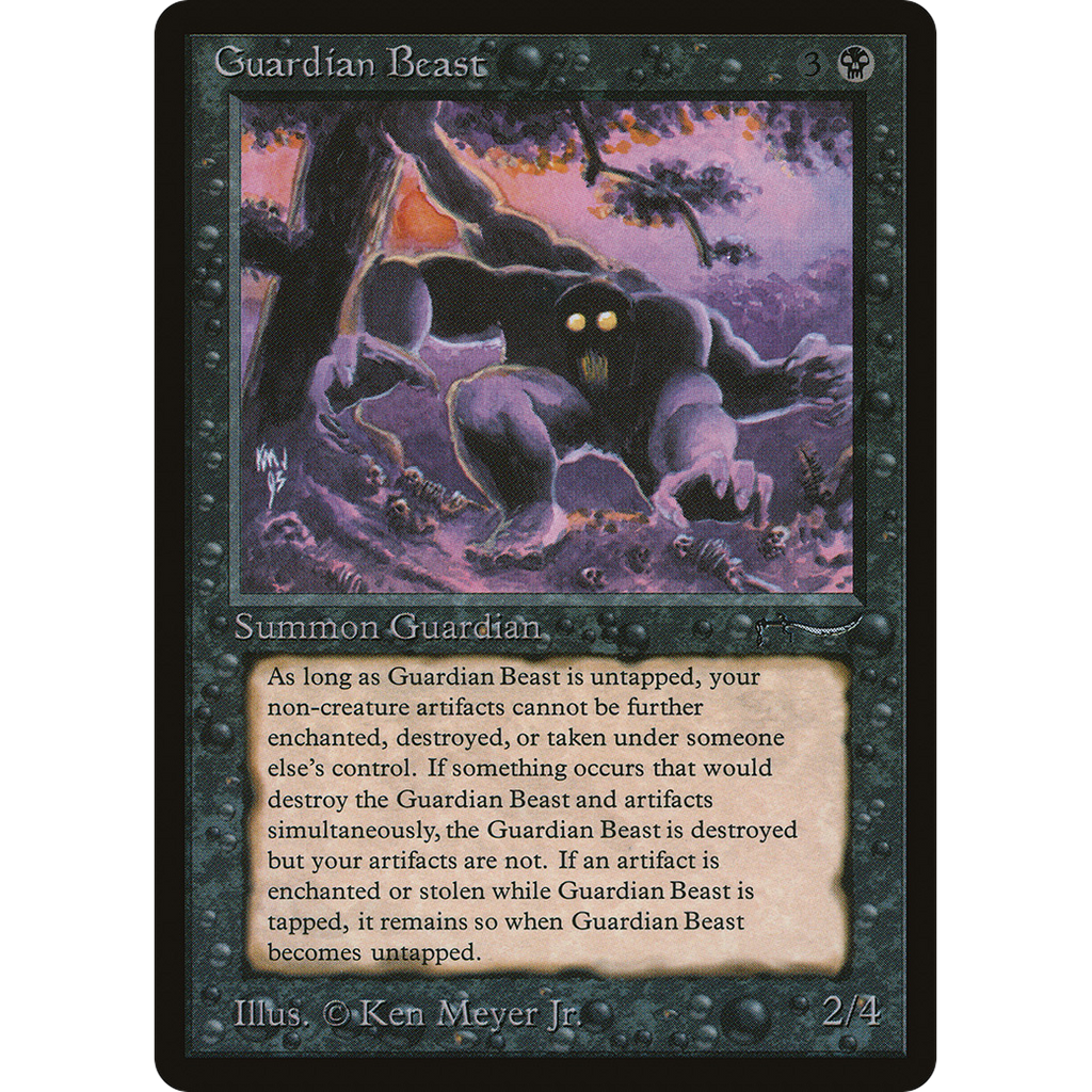 As long as Guardian Beast is untapped, noncreature artifacts you control can't be enchanted, they have indestructible, and other players can't gain control of them. This effect doesn't remove Auras already attached to those artifacts.