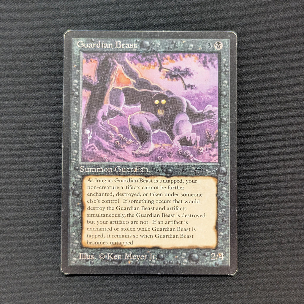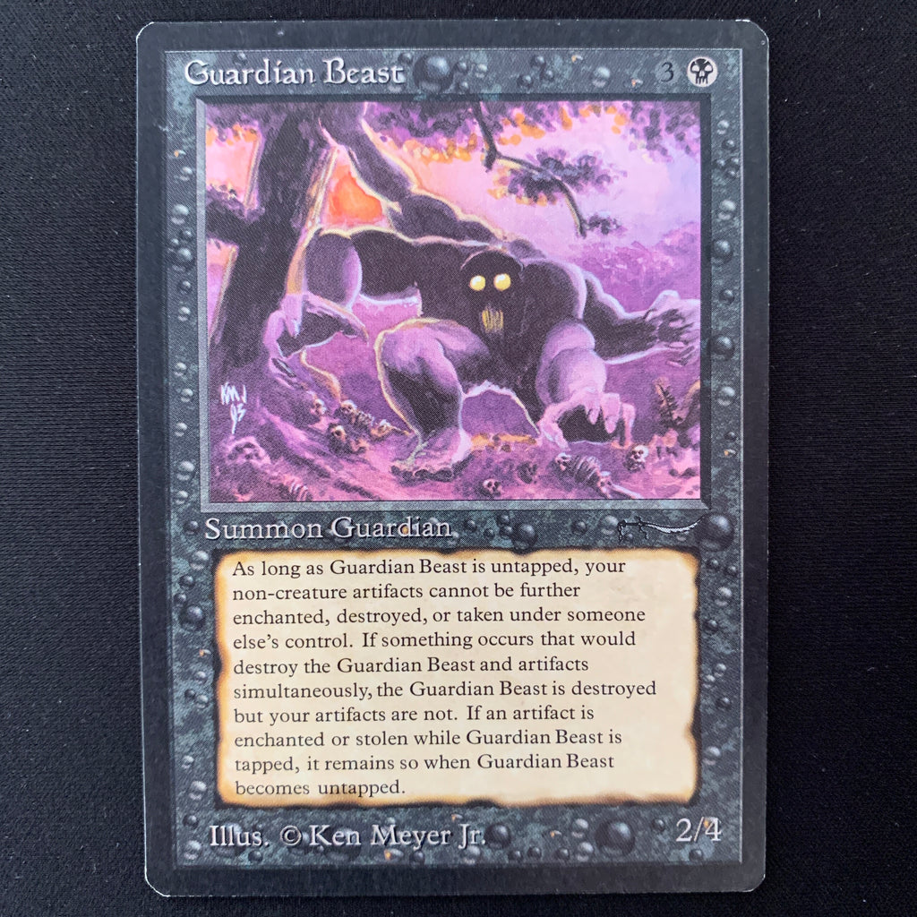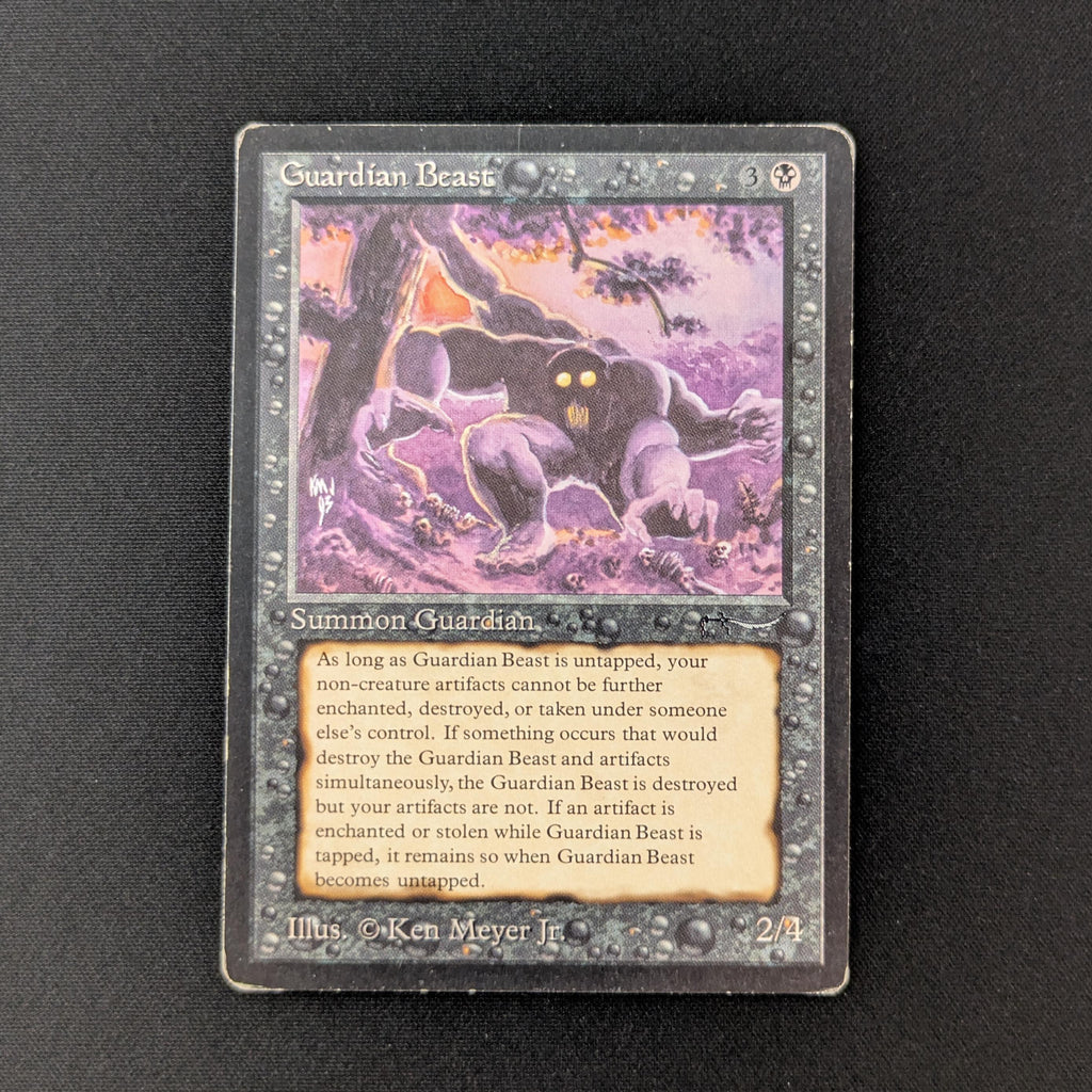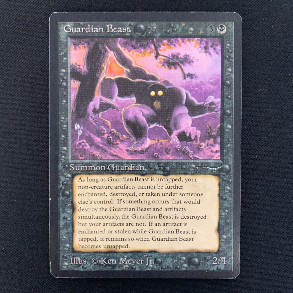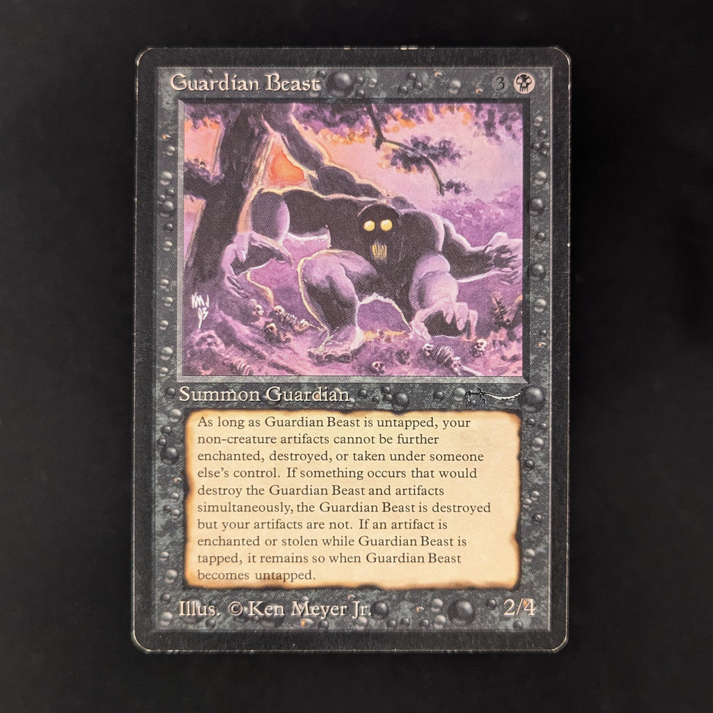 As long as Guardian Beast is untapped, noncreature artifacts you control can't be enchanted, they have indestructible, and other players can't gain control of them. This effect doesn't remove Auras already attached to those artifacts.