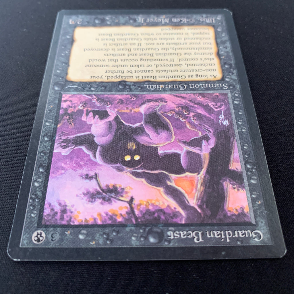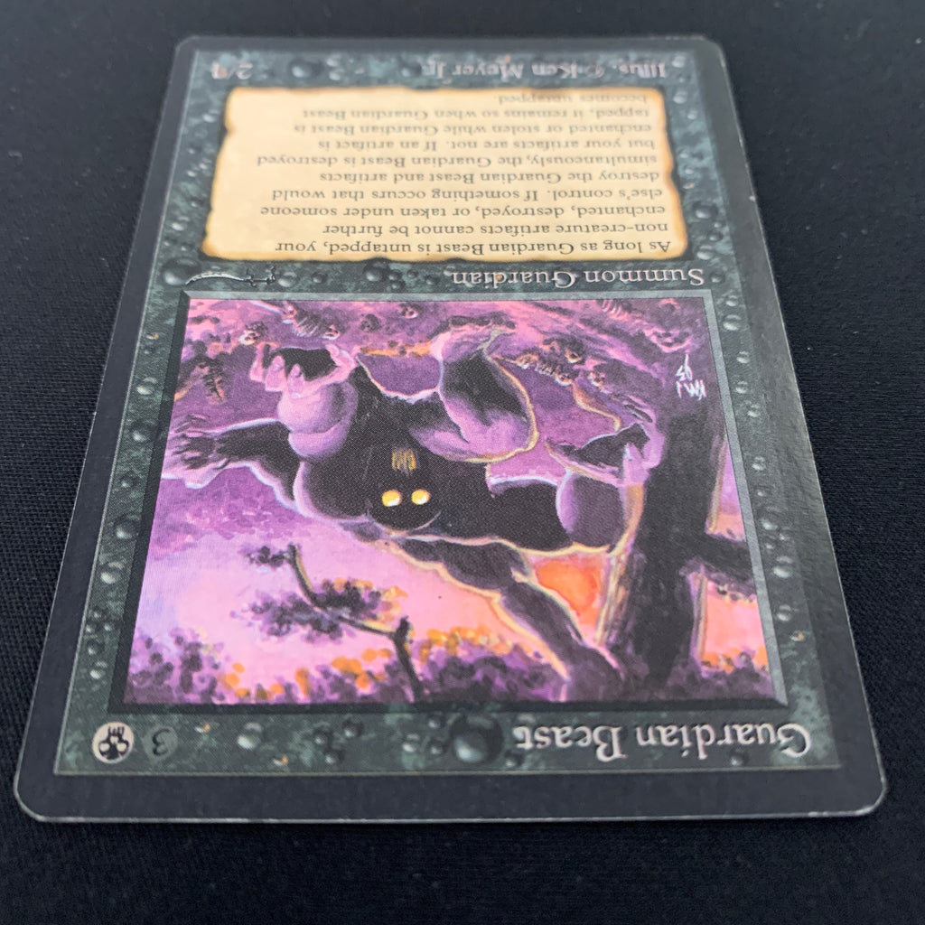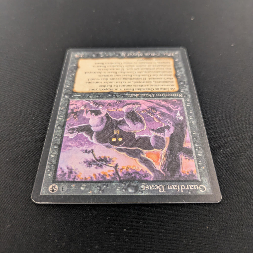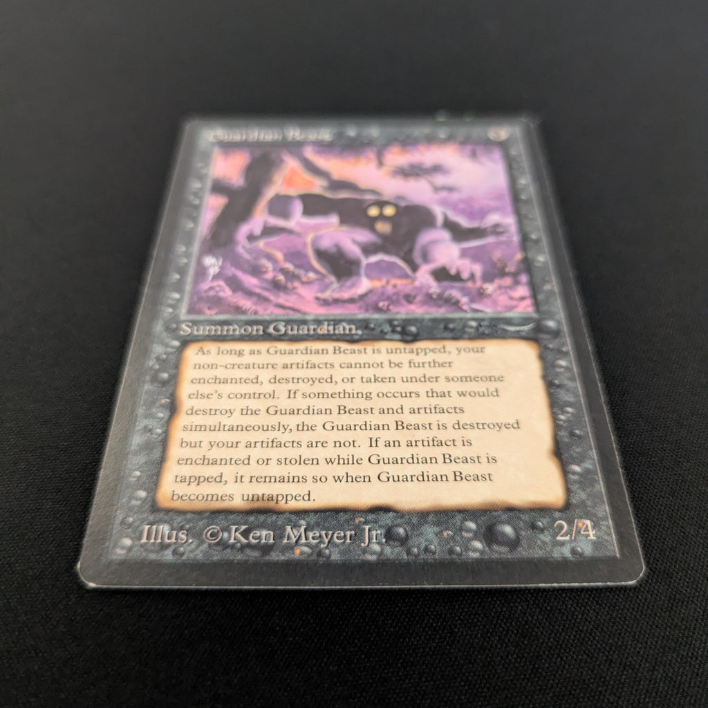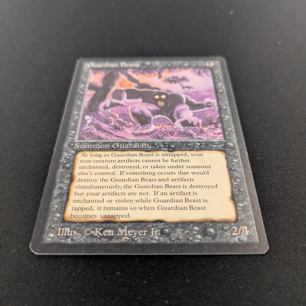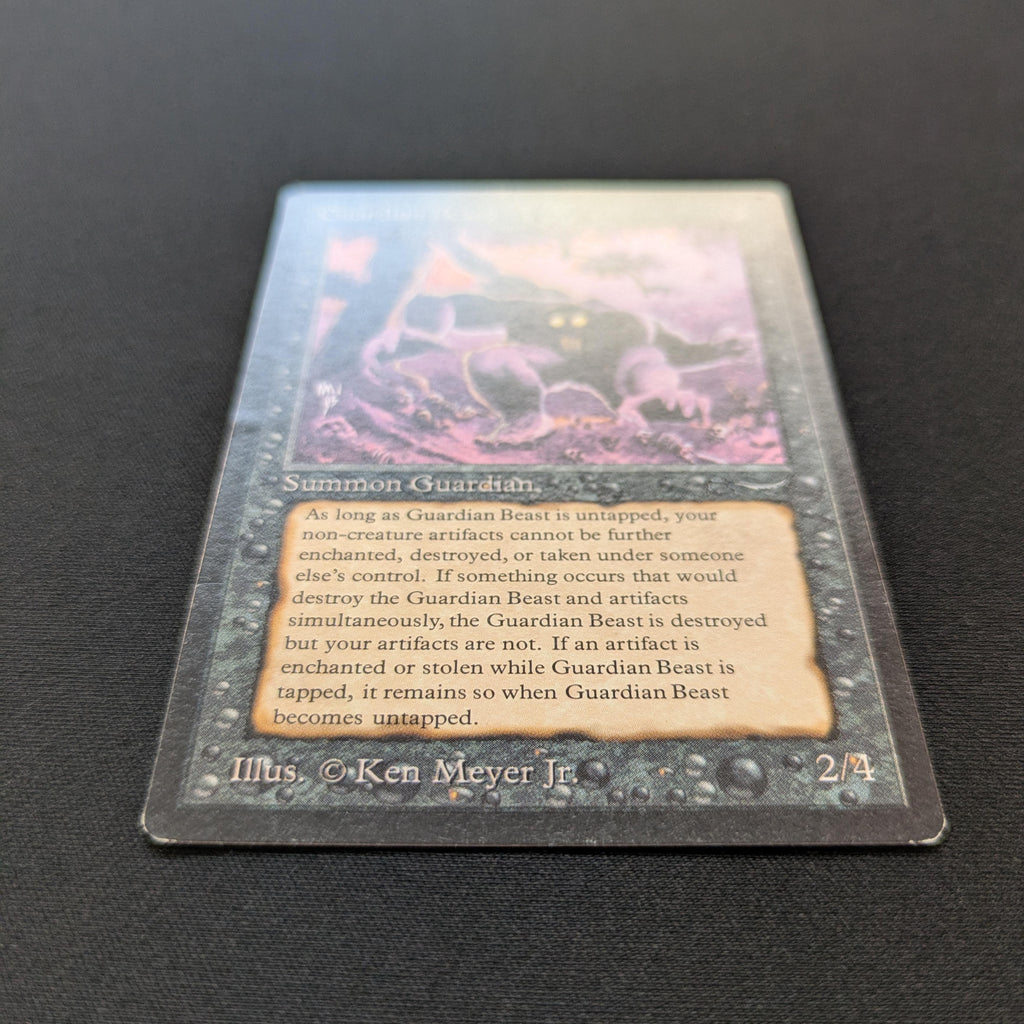As long as Guardian Beast is untapped, noncreature artifacts you control can't be enchanted, they have indestructible, and other players can't gain control of them. This effect doesn't remove Auras already attached to those artifacts.