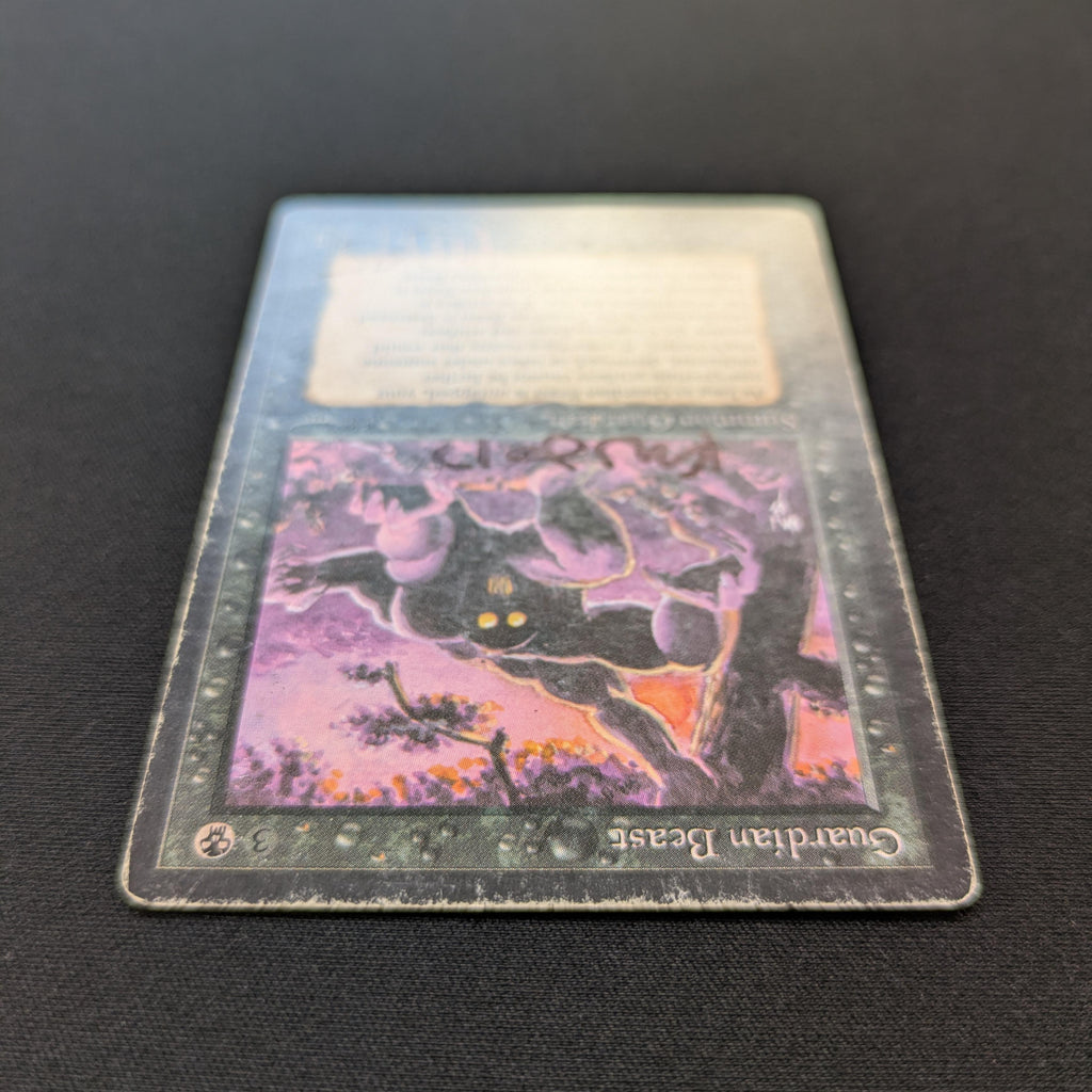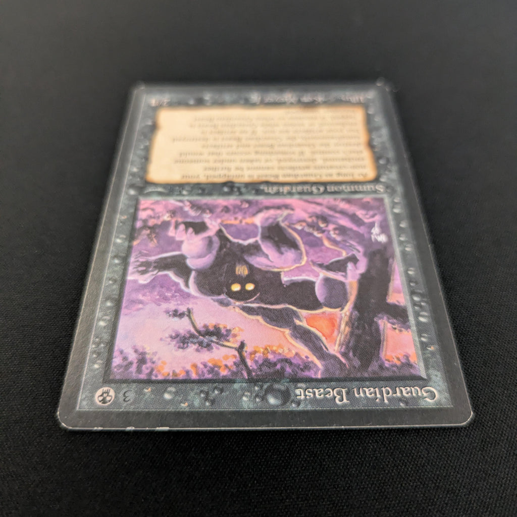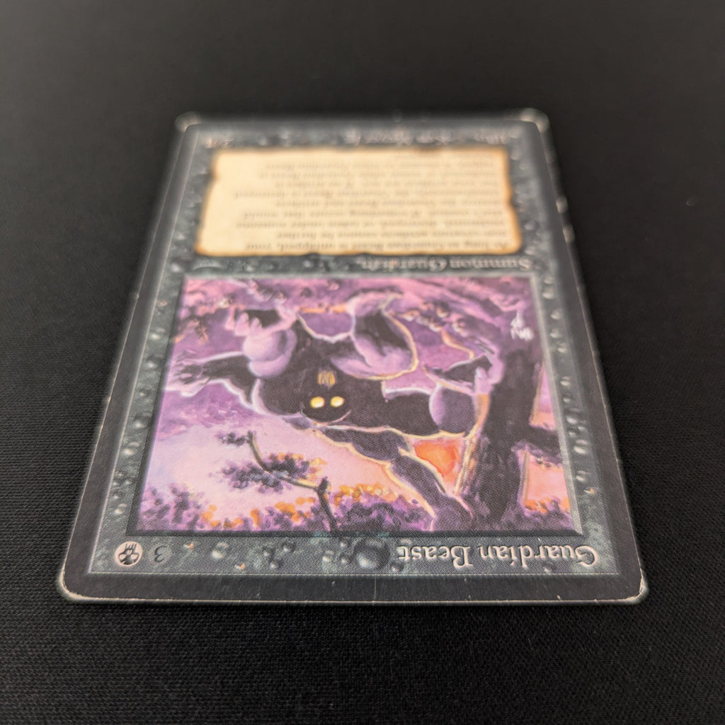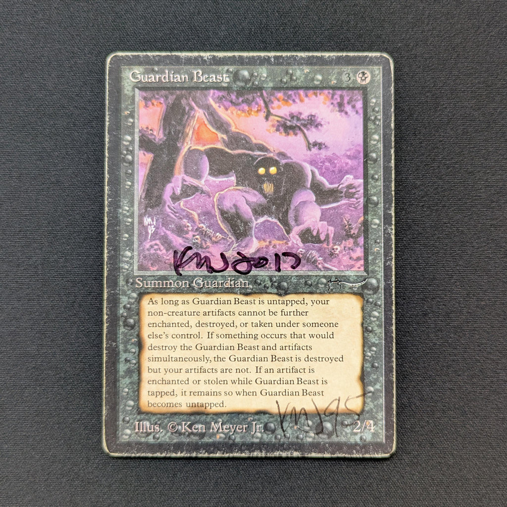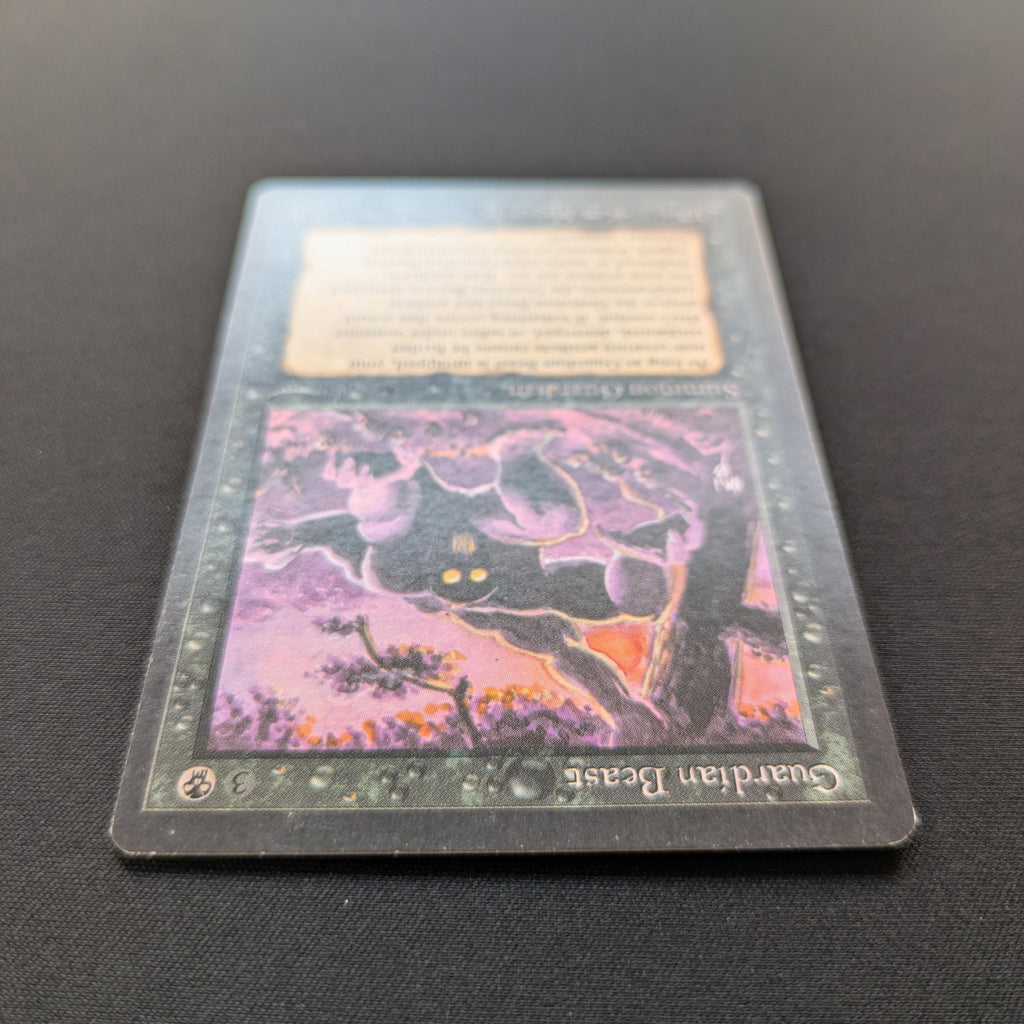 As long as Guardian Beast is untapped, noncreature artifacts you control can't be enchanted, they have indestructible, and other players can't gain control of them. This effect doesn't remove Auras already attached to those artifacts.